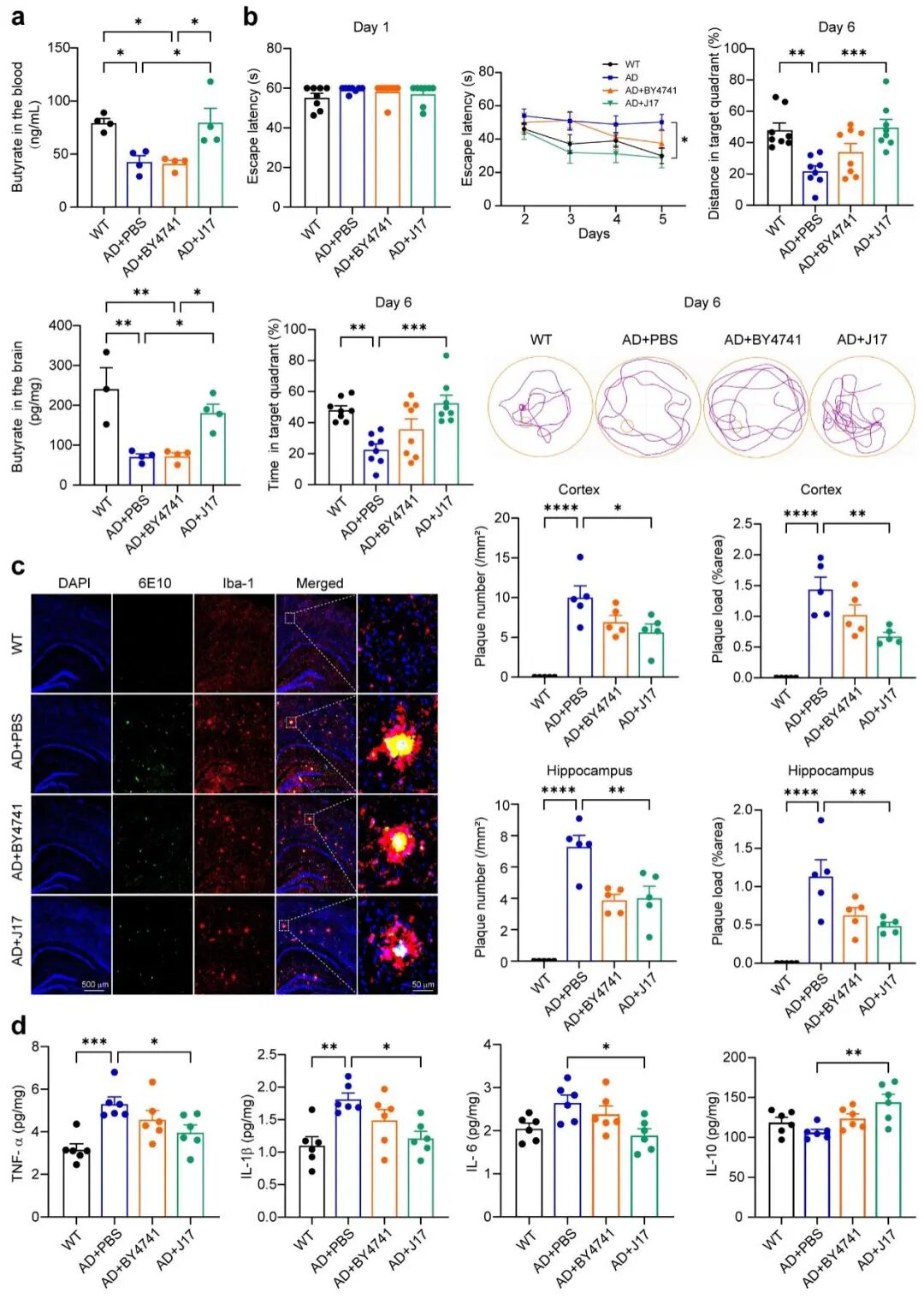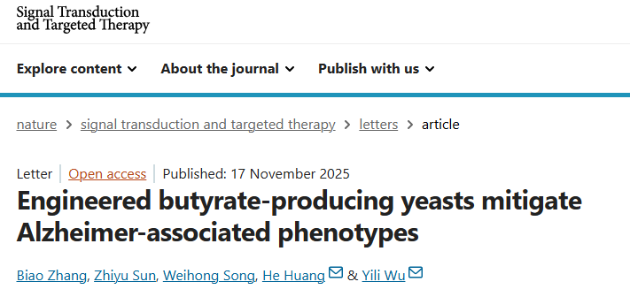 2025年11月17日,瓯江实验室宋伟宏院士团队吴伊丽研究员课题组联合天津大学合成生物与生物制造学院、合成生物技术全国重点实验室黄鹤教授团队,在《Signal Transduction and Targeted Therapy》杂志(IF:52.7)在线发表题为“Engineered butyrate-producing yeasts mitigate Alzheimer-associated phenotypes”的研究论文。该研究发现丁酸盐在AD小鼠的血液和大脑中显著减少。自主研发的产丁酸工程酵母J17可以有效缓解AD模型小鼠的丁酸盐缺乏,减少Aβ沉积,并显著改善其认知障碍。抑制BACE1介导的APP剪切和Aβ生成,减轻小胶质细胞的过度激活和神经炎症是J17改善AD小鼠认知障碍的关键机制。本研究证明基于益生菌和丁酸盐协同作用的产丁酸工程酵母J17是一种有效的AD防治方法。该研究不仅揭示了丁酸通过多靶点调控Aβ代谢与神经炎症的作用网络,还为开发基于微生物-肠-脑轴的AD防治策略提供了新思路。