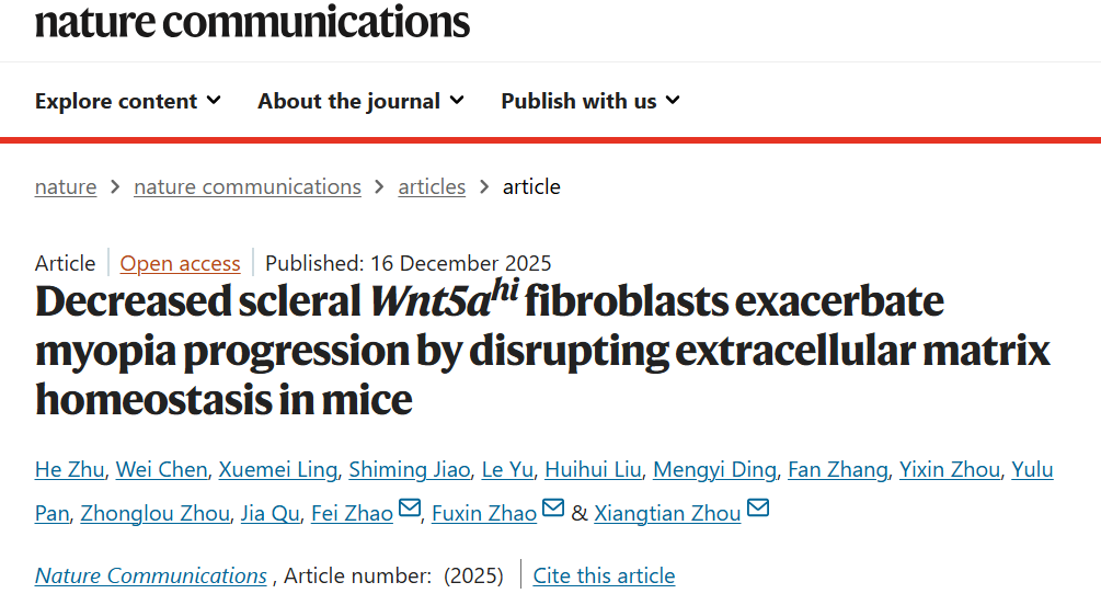 近日,瓯江实验室周翔天研究员团队联合温州医科大学附属眼视光医院赵福新、赵斐研究员,在 Nature Communications 上发表题为《Decreased scleral Wnt5ahi fibroblasts exacerbate myopia progression by disrupting extracellular matrix homeostasis in mice》的研究论文。