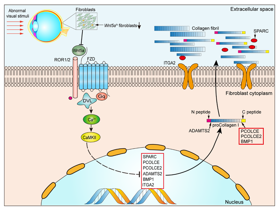 该研究的重要意义在于首次明确了近视发生过程中一个具体的细胞来源。以往关于巩膜重塑的研究多停留在分子或组织层面,而本工作将焦点精准定位到 Wnt5a 高表达成纤维细胞这一“关键少数”,揭示了近视并非简单的胶原减少,而是特定细胞群体数量和功能失衡所引发的连锁反应。这一认识不仅加深了对近视发病机制的理解,也为干预策略提供了全新的思路。