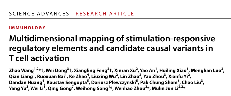 2026年1月2日(纽约时间1月1日),瓯江实验室宋伟宏院士团队王朝课题组联合广州医科大学附属妇女儿童医疗中心李俊教授课题组和周文浩教授课题组,在国际科学期刊《科学进展》(Science Advances)在线发表突破性研究成果“Multidimensional mapping of stimulation-responsive regulatory elements and candidate causal variants in T cell activation”,瓯江实验室为第一完成单位。