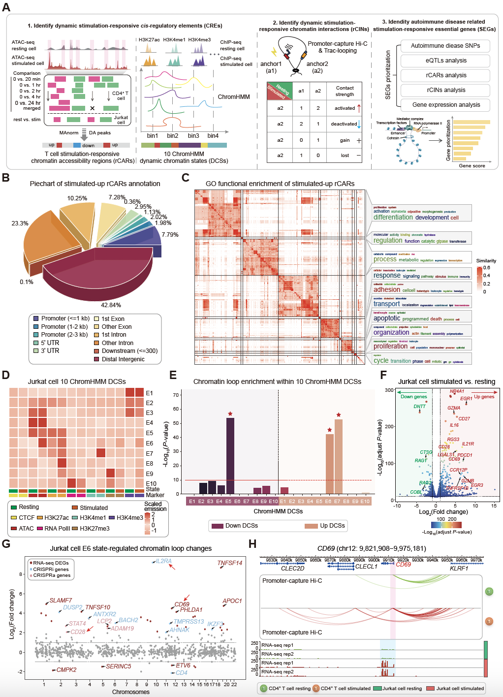 在人类基因组中,超过90%的疾病相关遗传变异藏身于非编码区域。这些区域如同“暗物质”,长期阻碍着功能基因组学研究与精准医学发展。尽管全基因组关联研究(GWAS)已发现许多与免疫相关疾病关联的非编码变异,但如何解析其作用机制及特定背景依赖性仍然是该领域的重大挑战。因此,团队开发了一种融合多层证据的综合方法,以CD4+ T细胞的激活作为模型系统,深入表征并整合了多层调控基因组学、功能基因组学和围绕T细胞刺激的遗传证据,描绘了T细胞激活过程中的动态调控图谱,成功鉴定出一系列刺激响应性基因、调控元件和候选因果变异。