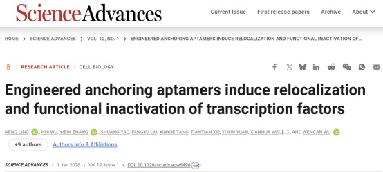 近日,瓯江实验室吴文灿研究员团队联合湖南大学叶茂团队在Science Advances 在线发表题为“Engineered anchoring aptamers induce relocalization and functional inactivation of transcription factors”的研究论文。该研究通过模拟细胞内锚定蛋白调控靶标蛋白定位的作用机制,开发了锚定核酸适体作为转录因子重定位的通用平台。锚定核酸适体是一种异源双功能核酸分子,由连接子连接两个配体构成:一个配体靶向质膜锚定蛋白,另一个配体则募集特定的转录因子。作为概念验证,作者利用靶向Ras蛋白的Ra1核酸适体,以及特异性识别p65或E2F1的DNA配体,构建了相应的锚定核酸适体。锚定核酸适体同时结合Ras蛋白与p65或E2F1,能有效诱导p65或E2F1向细胞质重新定位并使其功能失活。通过使用锚定核酸适体的慢病毒表达系统,作者实现了p65在细胞质中的持续滞留,并显著抑制了肿瘤生长。本研究建立了一个通用的转录因子重定位平台,为开发创新的抗癌治疗策略提供了重要思路。