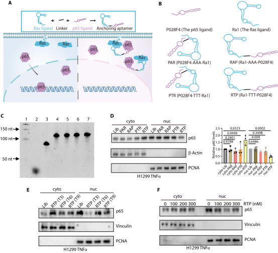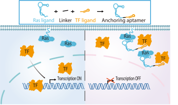 图1. 锚定核酸适体的设计思路及作用机制。其由 Ras 配体、转录因子(TF)配体和连接子组成,通过同时结合 Ras 与 TF ,诱导TF胞质重定位及功能失活。