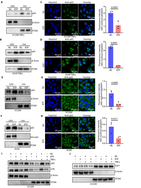 图4. RTP重定位p65。RTP 在诱导和非诱导条件下,均能使诱导NSCLC 细胞中 p65的胞质重定位,且这一作用具有特异性。