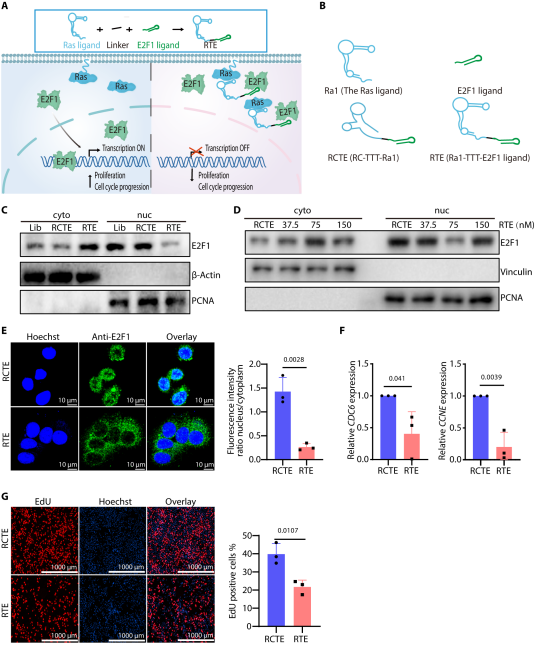 图8. 锚定核酸适体的通用性。设计靶向 E2F1 的锚定核酸适体 RTE,75nM 浓度即可诱导 E2F1 胞质重定位,下调其靶基因表达,阻滞细胞周期并抑制 HeLa 细胞增殖,验证该策略的普适性。