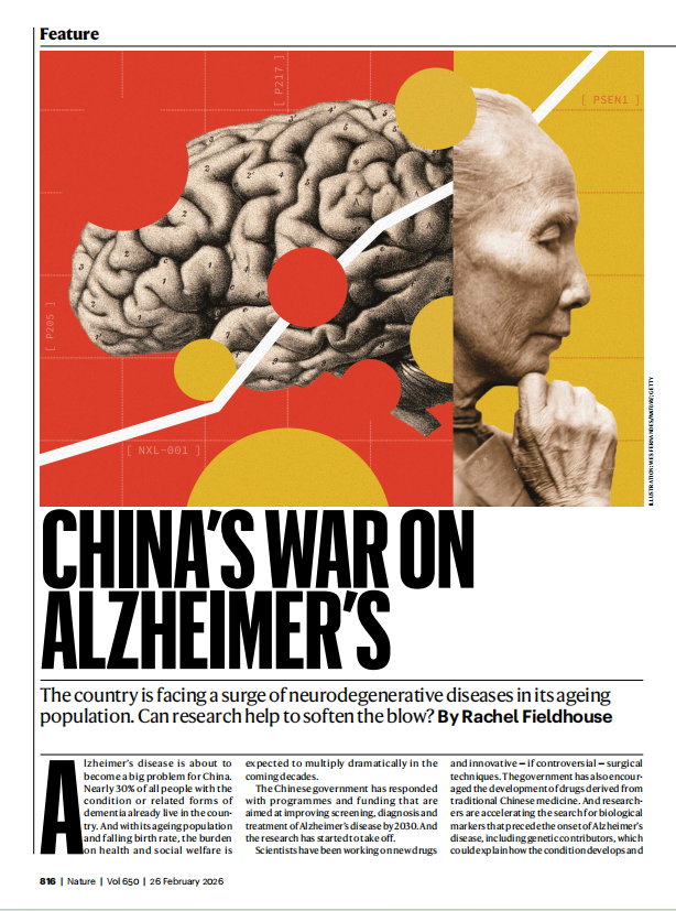 2026年2月24日,国际顶级学术期刊《Nature》杂志刊发头条报道,以“中国对抗阿尔茨海默病的战争”为题,深度剖析中国应对阿尔茨海默病(AD)这一重大公共卫生挑战的战略布局与科研进展。文章指出,随着人口老龄化加速,中国正面临日益严峻的AD疾病负担,但与此同时,中国在资金投入、人才引进、临床研究及原创药物研发等方面的系统性布局,值得世界借鉴。文章援引英国科学家原话:“也许中国会成为下一个领跑者。”
