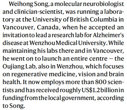 在这篇重磅报道中,国际知名的阿尔茨海默病专家、加拿大健康科学院院士、瓯江实验室主任宋伟宏作为中国AD研究领域的领军科学家之一,接受了《自然》的专访,介绍了瓯江实验室的定位、国家对AD研究的重视和对AD领域的投入, 以及中国对青年科学家的扶持。